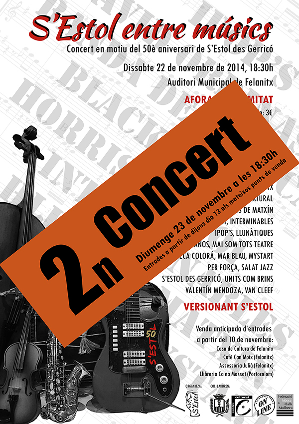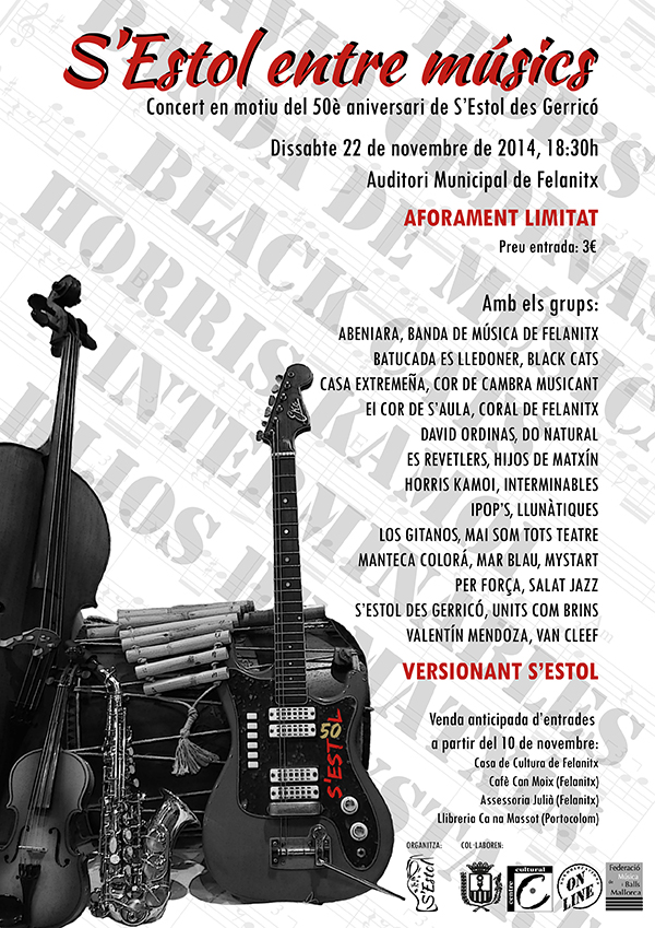 S’Estol des Gerricó proposa, en el darrer acte del seu 50è aniversari, un concert amb tots els grups musicals de Felanitx, dins la seva gran diversitat, on seran interpretades les peces del seu repertori però adaptades al peculiar estil de cadascun d’ells. Serà per tant un concert enormement eclèctic, variat i sorprenent, on la creativitat serà l’estrella de la vetllada. Una proposta nova, única i molt arriscada, però plena d’il·lusió i esforç. Esperar 50 anys potser haurà valgut la pena.
