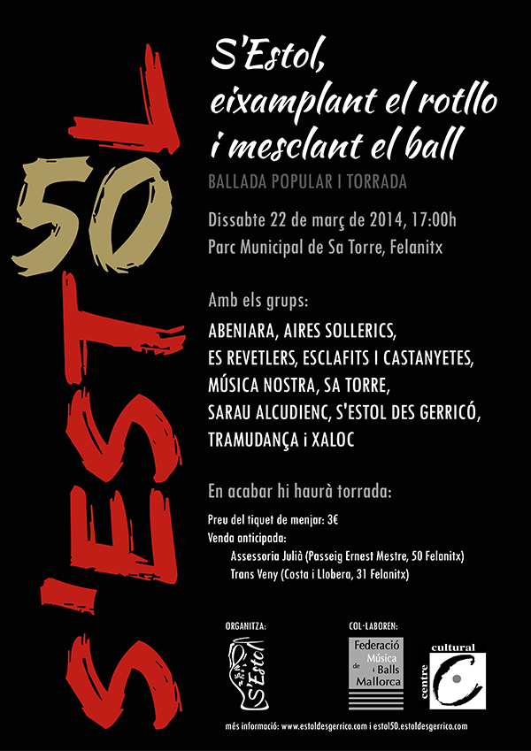 L’any 2014 es compleixen els primers 50 anys de vida del grup de música i ball tradicional mallorquí “S’Estol des Gerricó” de Felanitx. Per celebrar-ho, el grup ha programat una sèrie d’activitats que es duran a terme al llarg de l’any i que seran presentades el pròxim divendres 3 de gener de 2014 a les 20 h. a la Casa de Cultura (Ca’n Prohens) de Felanitx, presentació a la qual té el gust de convidar-vos.